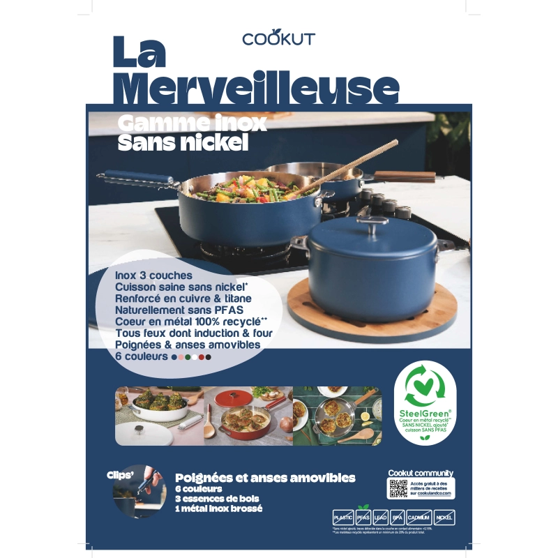 La casserole La Merveilleuse Cookut 20 cm (2,6 L) offre une cuisson précise et homogène grâce à son inox 3 plis : inox sans nickel pour la sécurité, cœur aluminium pour la chaleur uniforme, et inox ferritique pour induction. Renforcée cuivre pour la cuisson rapide et titane pour la solidité, elle est pratique et saine pour tous les jours.